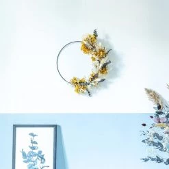Les feuilles d’eucalyptus soulignent le jaune moutarde de l’hortensia tandis que les fines fleurs blanches de gypsophile et les pointes duveteuses du lagurus apportent douceur et légèreté à cette couronne de fleurs séchées.