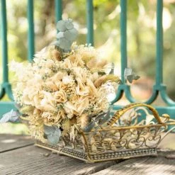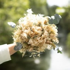 Le brun du lagurus naturel et le bleu des dĂ©licates fleurs de gypsohile relĂšvent le ton crĂšme et naturel de l’hortensia, piĂšce maĂźtresse de ce bouquet de fleurs sĂ©chĂ©es. Les grandes feuilles d’eucalyptus, d’avoine et de sĂ©taire complĂštent le tout pour un bouquet de fleurs sĂ©chĂ©es champĂȘtre et Ă©lĂ©gant.