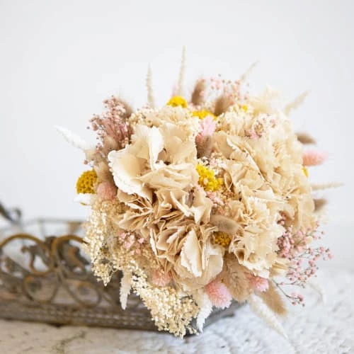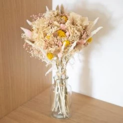Pastel et délicat, ce bouquet de fleurs séchées se veut délicat et élégant.