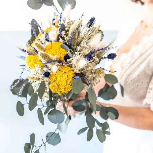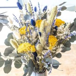 L’ achillea parker jaune, la lavande et l’eucalyptus populus se marient Ă merveille dans ce bouquet de fleurs sĂ©chĂ©es Ă la fois Ă©lĂ©gant et champĂȘtre. Les grandes tiges de sĂ©taire et de blĂ© barbu donne un cĂŽtĂ© trĂšs naturel Ă l’ensemble tandis que le jaune de l’achillea et le bleu de la lavande et du phalaris rĂ©veille ce bouquet de fleurs sĂ©chĂ©es fait pour durer.