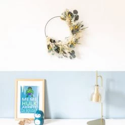 Le jaune du phalaris et le bleu du gypsophile tranche avec le blanc du ruscus et du broom pour un résultat dynamique. L’avoine et le sétaire donnent un côté champêtre tandis que l’eucalyptus populus structure cette couronne de fleurs séchées faite pour durer.