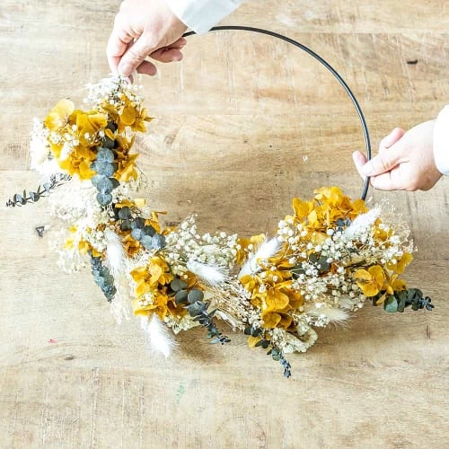 Toutes nos couronnes de fleurs séchées sont réalisées à la main et à la commande dans notre atelier de la région parisienne.