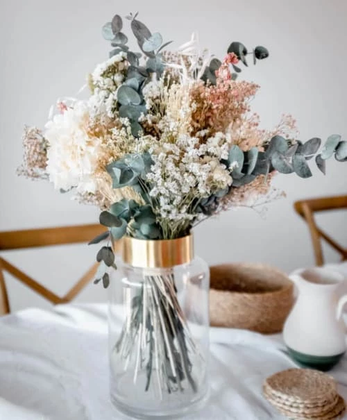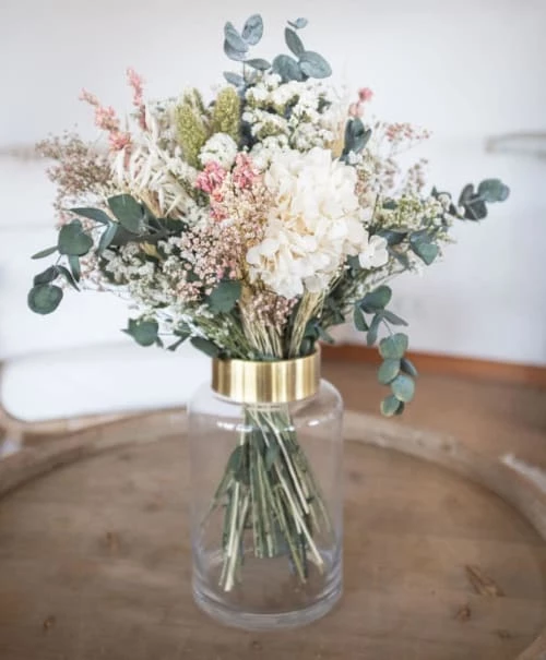 Setarea, eucalyptus séché, hortensia blanc préservé, gypsophile rose , limonium blanc, delphinium rose et avoine blanche