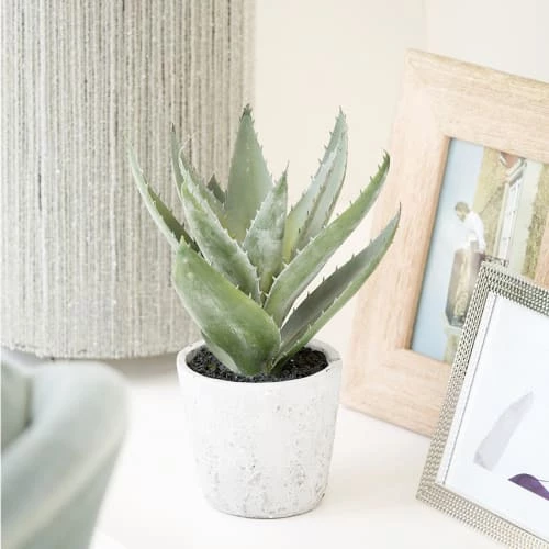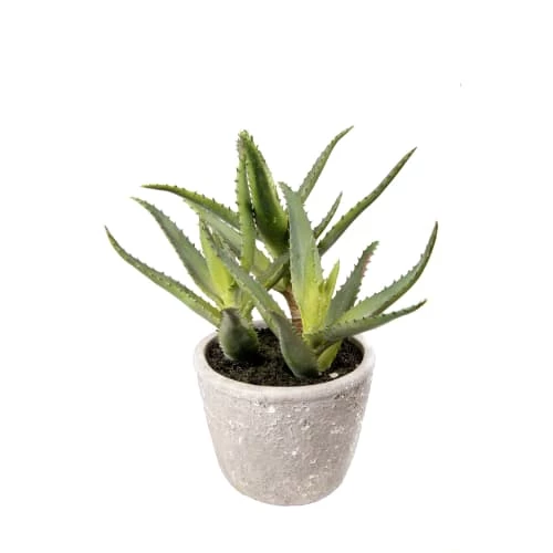 Plante artificielle d’Aloe Vera en pot d’Argile effet ciment garni de mousse. Sa petite taille vous permettra de disposer cette plante verte sur un bureau ou une étagère pour une touche de verdure zen.