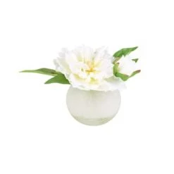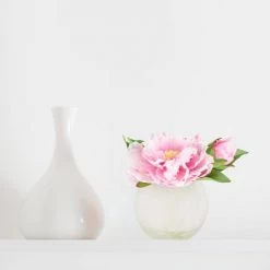 Petit arrangement de pivoines artificielles de couleur rose dans un pot enverre craquelé.