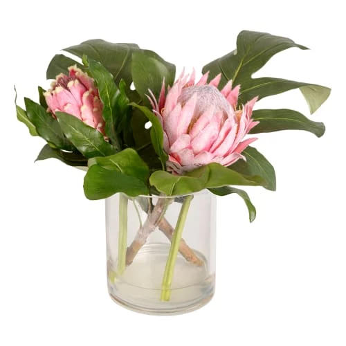 Composition:30%polyester 20%plastique 10% mousse 10% fil de fer 5% colle 15 % vase en verre 10% d’eau artificielle