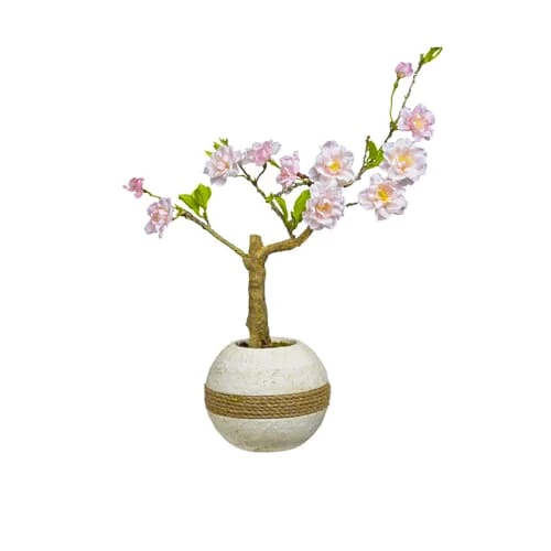 Petit cerisier fleurien pot rond orné de corde.Cetarbuste feuillu en pot habillera de manière très sobre votre intérieur.
