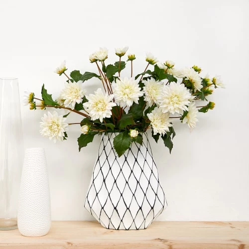 Tige artificielle de Dahlia avec feuilles. Le dahlia apportera à votre intérieur une touche romantique et sobre grâce à sa tête de fleur généreuse. Certaines déclinaisons de cette tiges présentent des bourgeons très réalistes.