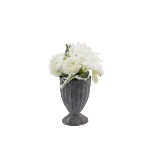 Fleurs Arwen artificielles enneigées dans un pot sculpté en fer. Composition de roses blanches et feuillage. Idéal à offrir et pour décorer un meuble grâce à son pot au look vintage et champêtre qui apporte un côtéchicà votre intérieur.