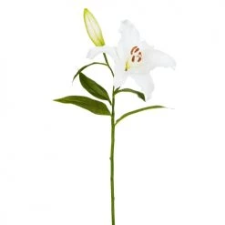 Tige de Lys Rubrum artificiel. Le lys se démarque par son élégance naturelle et se suffit à lui même pour décorer un vase mais peut aussi être utilisé dans des compositions florales sophistiquées. Cette magnifique tige ornée de feuilles et d’un bourgeon est réalisée à la main.
