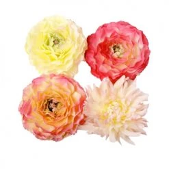 Mix de4 têtes de dahlias et renoncules sur un autocollant. Cet assortiment est idéal pour égayer une table de fête ou disposer dans une coiffure pour vos célébrations.