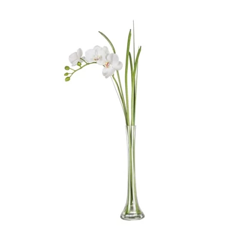 Orchidée artificielle en illusion d’eau dans sonlong et fin vase transparent en verre. Elle comporte 5 têtes de fleur et 4 bourgeons. Le charme et la popularité de l’orchidée réside dans ses fleurs rondes aux larges pétales qui la rendent élégante naturellement.